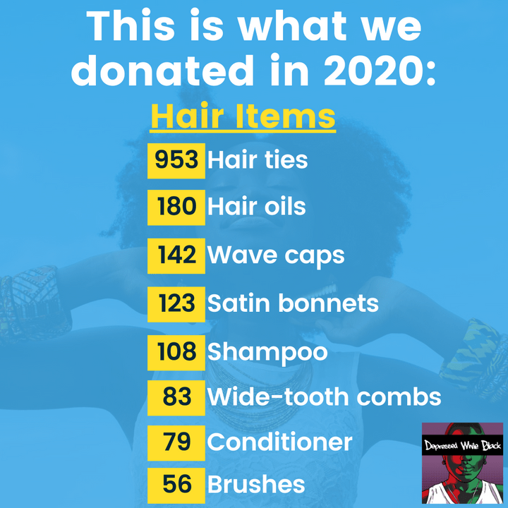Depressed While Black also provides Black beauty supply kits for psychiatric patients where each individual kit includes all-natural travel-size shampoo, conditioner, hair oil, and shea body butter. The kit also includes chapstick, a satin bonnet, a wave cap, a wide-tooth comb, and a handle-less brush. These items are sourced from Black-owned businesses.